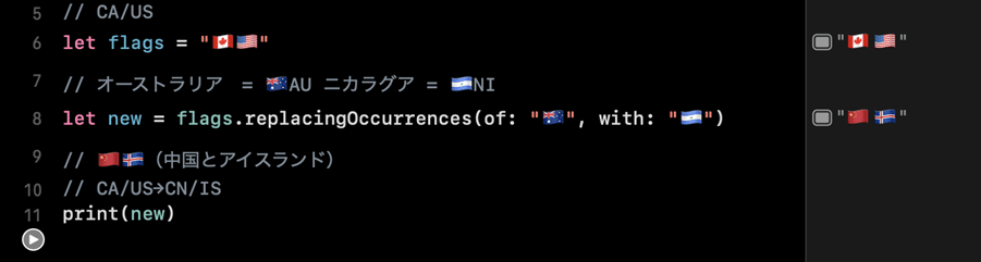 国の絵文字をreplacingOccurrences(of:with:)で置換すると、別の国の国旗に変わるという意外な挙動。(ニカラグア知らなかったので勉強になりました。)