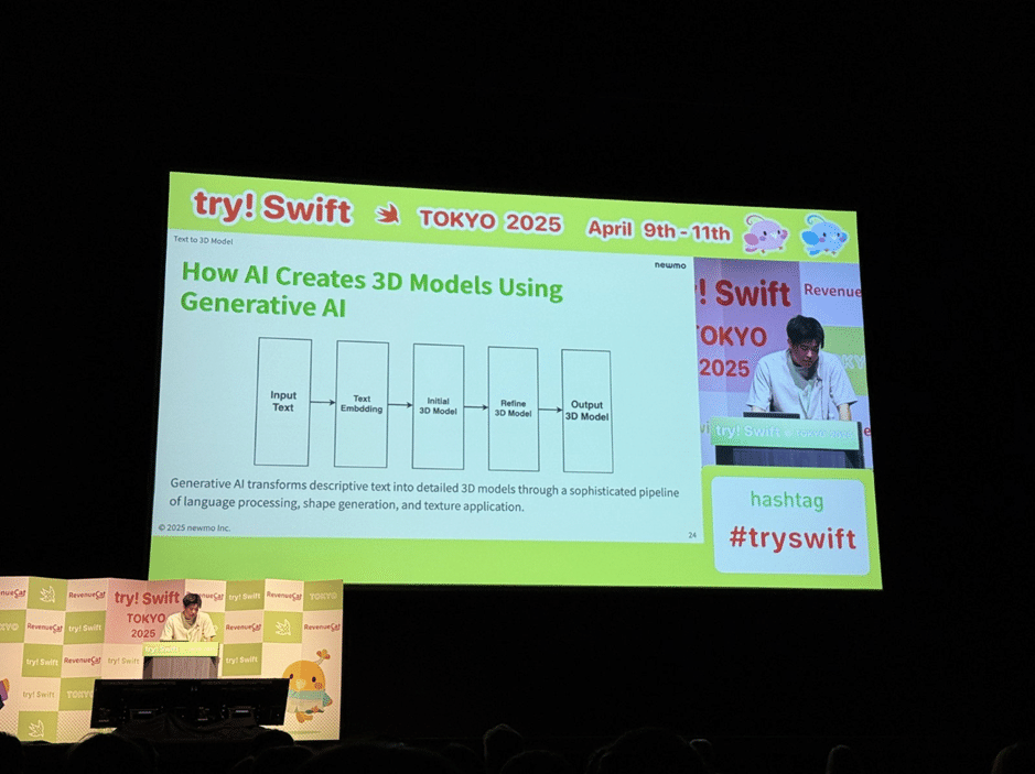 このセッションでは、 Vision Pro (visionOS)と生成型AIを組み合わせて、テキストプロンプトからリアルタイムで3Dオブジェクトを生成する手法が紹介されました。