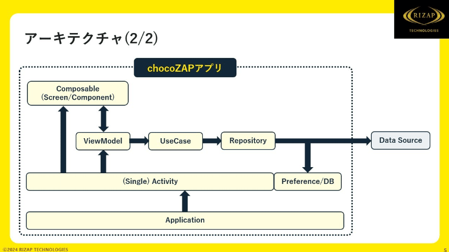 ここからはchocoZAPアプリのアーキテクチャの紹介となり、まずは1ページ目です。 まずこちらは簡略的なModule構成です。実際は完全にこの通りに分類して運用できてはいないですが、細かいModuleを分類していくとこの範囲に収まる、といったものです。