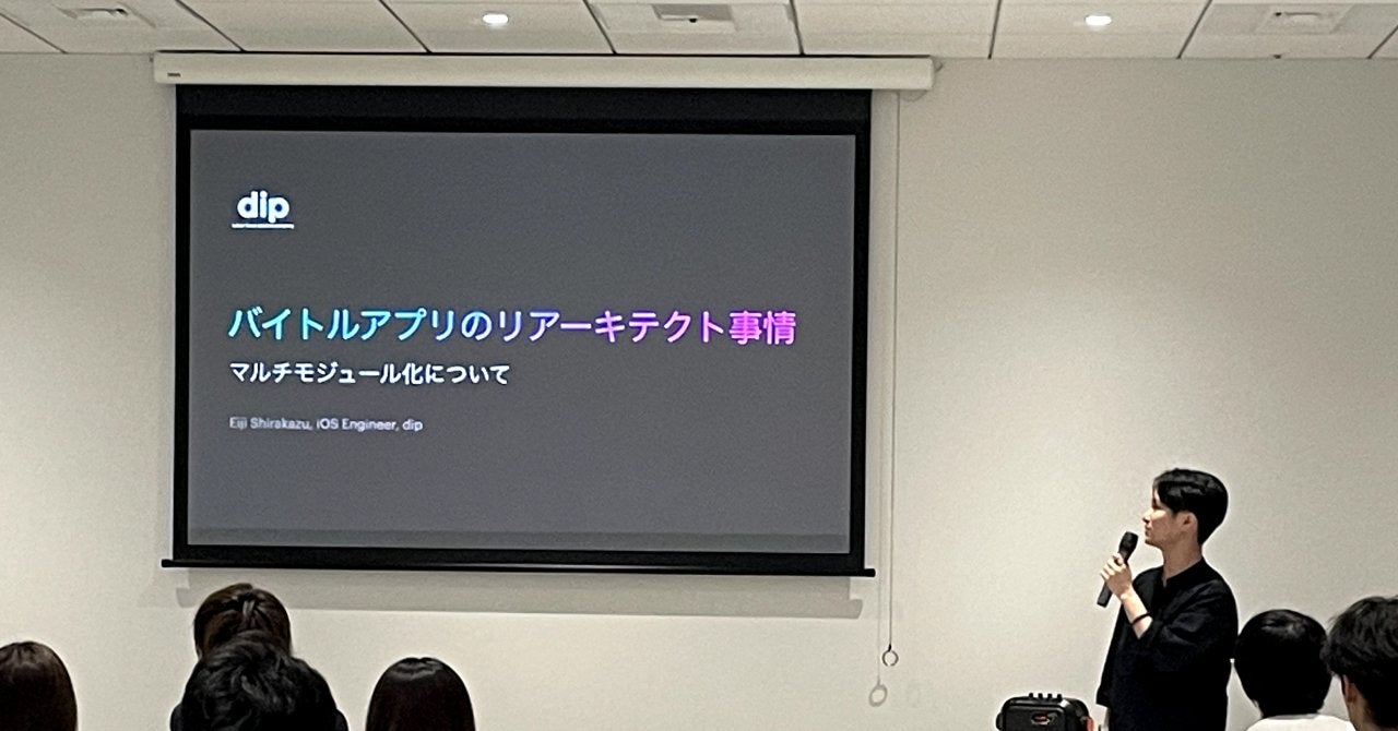 トップバッターは、dip バイトル iOSアプリ リアーキテクトチームの白数叡司(しらかずえいじ)さん。入社3年目という白数さんは、「バイトルアプリのリアーキテクト事情」というテーマで登壇し、リアーキテクト化の中でも「マルチモジュール化」について発表してくださいました。