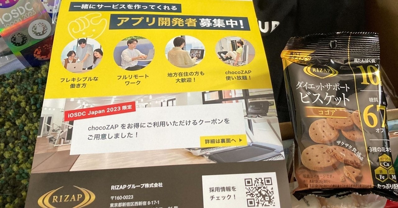 まず、iOSDC参加者全員に事前配送されるノベルティBOXには、RIZAPオリジナルの糖質オフビスケットをご用意。
